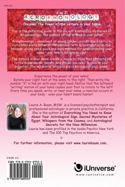 This is the definitive guide to the ancient Kabbalistic mysteries of acrophonology, the science of the letters in your name! Acrophonology-movement of sound (phono) across space (acro)-correlates every letter in the alphabet with a constellation in the heavens, giving you a quick and easy method for understanding your name-and how it influences you! The letters in your name create a magnetic field that attracts you to the experiences, people, and places you need to realize your potential. The wisdom of who you are is encoded in your name! Experience the power of your name! Rotate your right foot at the ankle to the right. Then write the number "6" in the air with your right hand. Notice that the leftward "writing" motion of your hand causes your foot to rotate to the left! Every time you speak, write, or hear your name, a reaction occurs in your body-even your heart beats faster!