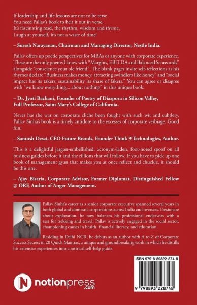 If leadership and life lessons are not to be terse You need Pallav's book to belt it out in verse, It's fascinating read, the rhythm, wisdom and rhyme, Laugh at yourself, it's not a waste of time! - Suresh Narayanan, Chairman and Managing Director, Nestle India. Pallav offers up poetic perspectives for MBAs or anyone with corporate experience. These are the only poems I know with "Margins, EBITDA and Balanced Scorecards" alongside "conscience your ole friend". The blank pages invite self-reflections as his rhymes declare "Business makes money, attracting swindlers like honey" and "social impact has its takers, sustainability its share of fakers." You can agree or disagree with "we know everything ... about nothing" in this unique book. - Dr. Jyoti Bachani, Founder of Poetry of Diaspora in Silicon Valley, Full Professor, Saint Mary's College of California. Never has the war on corporate cliche been fought with such wit and subtlety. Pallav Sinha's book is a timely antidote to the excesses of corporate verbiage. Good fun. - Santosh Desai, CEO Future Brands, Founder Think 9 Technologies, Author. This is a delightful jargon-embellished, acronym-laden, foot-noted spoof on all business guides before it and the zillions that will follow. If you have to pick up one book of management gyan that makes you at once reflect and chuckle, it should be this one. - Ajay Bisaria, Corporate Advisor, Former Diplomat, Distinguished Fellow @ ORF, Author of Anger Management.