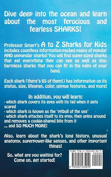 Dive deep into the ocean and learn about the most ferocious and fearless SHARKS! Professor Smart's A to Z Sharks for Kids includes countless information-packed pages of popular AND unpopular sharks! You will find super-sized sharks that eat everything they can see as well as tiny, harmless sharks that you can fit in the palm of your hand. Each shark (there's 65 of them!) has information on its status, size, lifespan, color, unique features, and more! In addition, you will learn:which shark covers its eyes with its tail when it gets scared which shark is known as the 'pitbull of the sea' which shark attaches itself to its prey, then spins around and removes a cookie-shaped bite from it ... and SO MUCH MORE! Also, learn about the shark's long history, unusual anatomy, superpower-like senses, and other important things! So, what are you waiting for? Click the "Add to Cart" button above to get started!