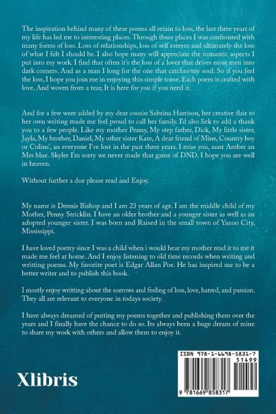 The inspiration behind many of these poems all retain to loss, the last three years of my life has led me to interesting places. Through these places I was confronted with many forms of loss. Loss of relationships, loss of self esteem and ultimately the loss of what I felt I should be. I also hope many will appreciate the romantic aspects I put into my work. I find that often it's the loss of a lover that drives most men into dark corners. And as a man I long for the one that catches my soul. So if you feel the loss, I hope you join me in enjoying this simple tome. Each poem is crafted with love. And woven from a tear, It is here for you if you need it. And for a few were added by my dear cousin Sabrina Harrison, her creative flair to her own writing made me feel proud to call her family. I'd also liek to add a thank you to a few people. Like my mother Penny, My step father, Dick, My little sister, Jayla, My brother, Daniel, My other sister Kate, A dear friend of Mine, Country boy or Colins', an everyone I've lost in the past three years. I miss you, aunt Amber an Mrs blue. Skyler I'm sorry we never made that game of DND. I hope you are well in heaven. Without further a due please read and Enjoy.