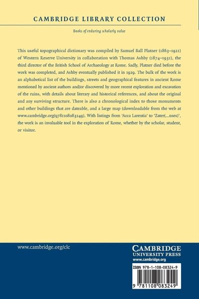 This useful topographical dictionary was compiled by Samuel Ball Platner (1863-1921) of Western Reserve University in collaboration with Thomas Ashby (1874-1931), the third director of the British School of Archaeology at Rome. Sadly, Platner died before the work was completed, and Ashby eventually published it in 1929. The bulk of the work is an alphabetical list of the buildings, streets and geographical features in ancient Rome mentioned by ancient authors and/or discovered by more recent exploration and excavation of the ruins, with details about literary and historical references, and about the original and any surviving structure. There is also a chronological index to those monuments and other buildings that are dateable, and a large map (downloadable from the web at www.cambridge.org/9781108083249). With listings from 'Acca Larentia' to 'Zater(...nses)', the work is an invaluable tool in the exploration of Rome, whether by the scholar, student, or visitor.