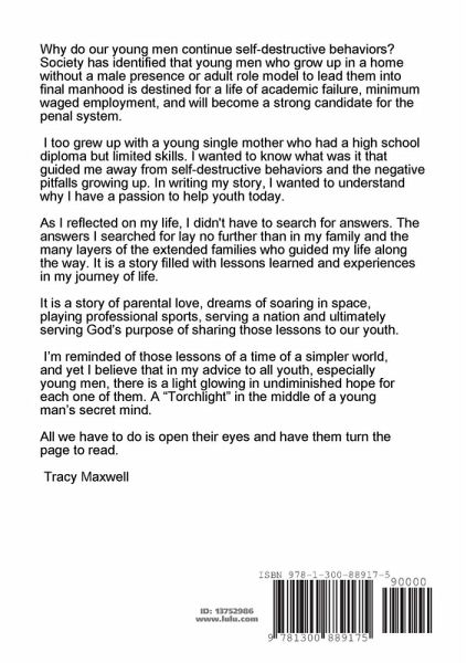 Why do our young men continue self-destructive behaviors? Society has identified that young men who grow up in a home without a male presence or adult role model to lead them into final manhood is destined for a life of academic failure, minimum waged employment, and will become a strong candidate for the penal system. It is a story of parental love, dreams of soaring in space, playing professional sports, serving a nation and ultimately serving God's purpose of sharing those lessons to our youth. I believe that in my advice to all youth, especially young men, there is a light glowing in undiminished hope for each one of them. A "Torchlight" in the middle of a young man's secret mind. All we have to do is open their eyes and have them turn the page to read. Tracy Maxwell