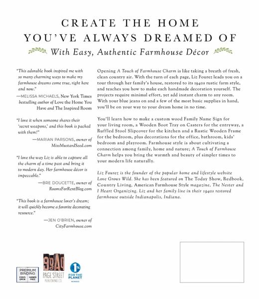 A Touch of Farmhouse Charm is just what home crafters have been waiting for - simple decorations and standout furniture pieces they can make themselves. Liz Fourez, of the website Love Grows Wild, has spent the last several years renovating an old farmhouse into a home filled with love and handmade things, the inspiration behind this book.