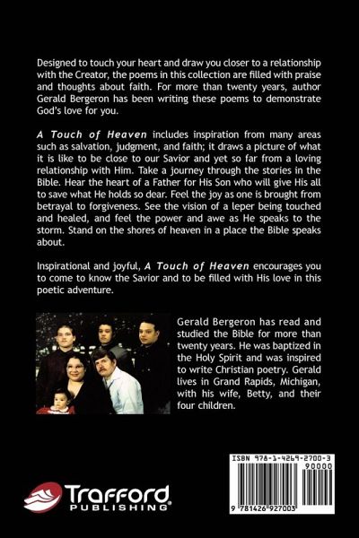 Designed to touch your heart and draw you closer to a relationship with the Creator, the poems in this collection are filled with praise and thoughts about faith. For more than twenty years, author Gerald Bergeron has been writing these poems to demonstrate God's love for you. A Touch of Heaven includes inspiration from many areas such as salvation, judgment, and faith; it draws a picture of what it is like to be close to our Savior and yet so far from a loving relationship with Him. Take a journey through the stories in the Bible. Hear the heart of a Father for His Son who will give His all to save what He holds so dear. Feel the joy as one is brought from betrayal to forgiveness. See the vision of a leper being touched and healed, and feel the power and awe as He speaks to the storm. Stand on the shores of heaven in a place the Bible speaks about. Inspirational and joyful, A Touch of Heaven encourages you to come to know the Savior and to be filled with His love in this poetic adventure.
