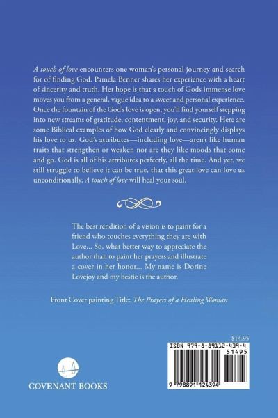 A touch of love encounters one woman's personal journey and search for of finding God Pamela Benner shares her experience with a heart of sincerity and truth. Her hope is that a touch of Gods immense love moves you from a general, vague idea to a sweet and personal experience. Once the fountain of the God's love is open, you'll find yourself stepping into new streams of gratitude, contentment, joy, and security. Here are some Biblical examples of how God clearly and convincingly displays his love to us. God's attributes--including love--aren't like human traits that strengthen or weaken nor are they like moods that come and go. God is all of his attributes perfectly, all the time. And yet, we still struggle to believe it can be true, that this great love can love us unconditionally. A touch of love will heal your soul.