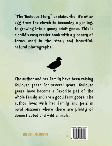 The Toulouse Story explains the life of an egg from the clutch to becoming a gosling, to growing into a young adult goose. This book is a unique but real story of transformation. This is a child's easy reader book with a glossary of terms used in the story and beautiful, natural photographs.