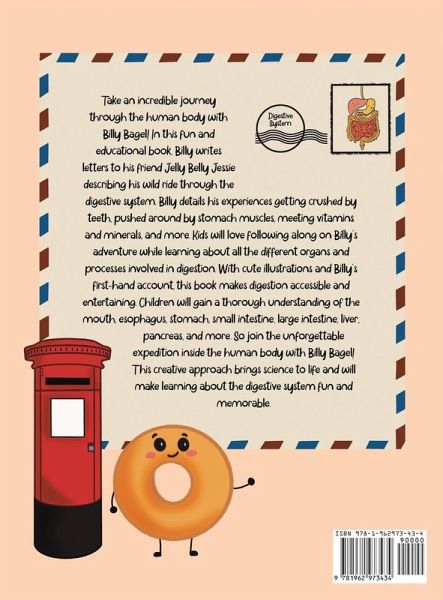 Take an incredible journey through the human body with Billy Bagel! In this fun and educational book, Billy writes letters to his friend Jelly Belly Jessie describing his wild ride through the Digestive System. Billy details his experiences getting crushed by teeth, pushed around by stomach muscles, meeting vitamins and minerals, and more. Kids will love following along on Billy's adventure while learning about all the different organs and processes involved in digestion. With cute illustrations and Billy's first-hand account, this book makes digestion accessible and entertaining. Children will gain a thorough understanding of the mouth, esophagus, stomach, small intestine, large intestine, liver, pancreas, and more. So join the unforgettable expedition inside the human body with Billy Bagel! "This creative approach brings science to life and will make learning about the digestive system fun and memorable."
