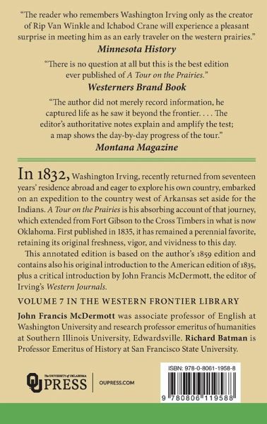 In 1832, Washington Irving, recently returned from seventeen years' residence abroad and eager to explore his own country, embarked on an expedition to the country west of Arkansas set aside for the Indians. A Tour on the Prairies is his absorbing account of that journey, which extended from Fort Gibson to the Cross Timbers in what is now Oklahoma. First published in 1835, it has remained a perennial favorite, retaining its original freshness, vigor, and vividness to this day.