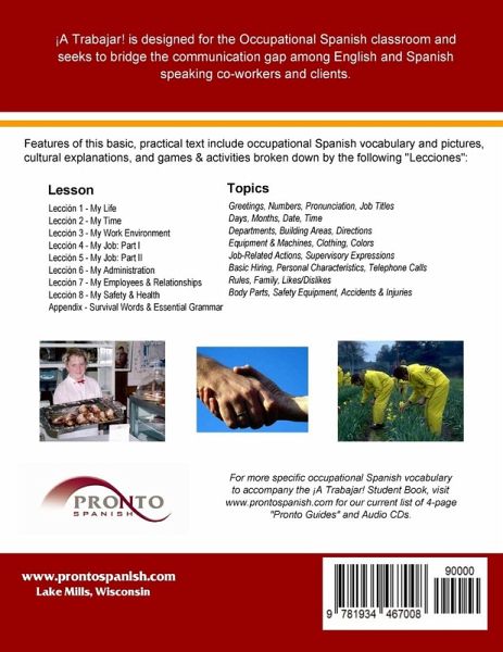 ¡A Trabajar! is an innovative occupational Spanish course that seeks to bridge the communication gap between English and Spanish-speaking co-workers and clients. The Student Workbook incorporates cooperative learning, role-playing, storytelling, and cross-cultural discussions to promote an interactive, student-centered learning experience. The Workbook covers the following topics: ¿My Life (Greetings, Numbers, Pronunciation, Job Titles) ¿My Time (Days, Months, Date, Work Schedules) ¿My Work Environment (Departments, Building Areas, Directions) ¿My Job: Part I (Equipment and Machines, Clothing, Colors) ¿My Job: Part II (Job-Related Actions, Supervisory Expressions) ¿My Administration (Basic Hiring, Characteristics, Telephone Calls) ¿My Employees and Relationships (Rules, Family, Likes and Dislikes) ¿My Safety and Health (Body Parts, Safety Equipment, Accidents) ¿Appendix - Survival Words and Essential Grammar