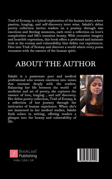 Trail of Ecstasy, is a lyrical exploration of the human heart, where passion, longing, and self-discovery inter wine. Sakshi's debut poetry collection invites readers on a journey through raw emotions and fleeting moments, each verse a reflection on love's complexities and life's transient beauty. With evocative imagery and heartfelt expression, this book offers a profound and intimate look at the ecstasy and vulnerability that define our experiences. Dive into Trail of Ecstasy and discover a world where every poem resonates with the essence of the human spirit.