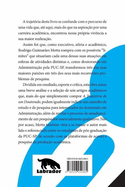 A trajetória deste livro se confunde com o percurso de uma vida que, até aqui, mais do que na aspiração por uma carreira acadêmica, encontrou nessa própria vivência a sua maior realização. Assim foi que, como executivo, atleta e acadêmico, Rodrigo Guimarães Motta rompeu com os possíveis limites que situariam cada uma dessas suas atuações em esferas de atividades distintas e, como doutorando em Administração pela PUC-SP, transformou três das suas maiores paixões em três dos seus mais recorrentes problemas de pesquisa. Dividida em resultado, esporte e crítica, esta obra reúne uma breve análise e a seleção de seis artigos acadêmicos que, mais do que simplesmente compor A Trajetória de um Doutorado, podem igualmente indicar um caminho de estudo e de pesquisa para interessados no doutorado em Administração, além de revelar o processo de amadurecimento de um pesquisador essencialmente qualitativo. Não por acaso, Motta também viria a se tornar o autor mais lido e referenciado entre os estudantes de pós-graduação da PUC-SP, de acordo com as plataformas de acesso e pesquisa da produção acadêmica.