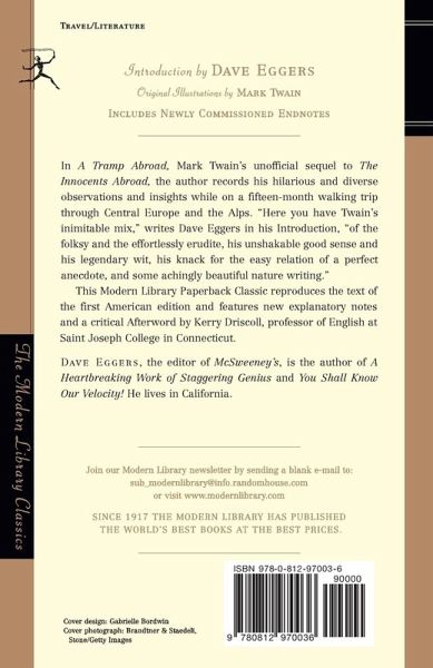 In A Tramp Abroad, Mark Twain's unofficial sequel to The Innocents Abroad, the author records his hilarious and diverse observations and insights while on a fifteen-month walking trip through Central Europe and the Alps. "Here you have Twain's inimitable mix,” writes Dave Eggers in his Introduction, "of the folksy and the effortlessly erudite, his unshakable good sense and his legendary wit, his knack for the easy relation of a perfect anecdote, and some achingly beautiful nature writing.” This Modern Library Paperback Classic reproduces the text of the first American edition and features new explanatory notes and a critical Afterword by Kerry Driscoll, professor of English at Saint Joseph College in Connecticut.