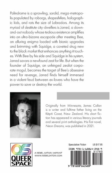 Palindrome is a sprawling, sordid, mega-metropolis populated by roborgs, shapeshifers, holographic kids, and rats the size of Labradors. Among its myriad of destitute city-dwellers is Jarred, a down-and-out nobody whose tedious existence amplifies into an ultra-bizarre escapade after meeting Bee, an alluring enigma loaded with bionic upgrades and brimming with Squidge, a coveted drug new to the black market that enhances anything it touches. With Bee by his side and Squidge in his system, Jarred savors a newfound zest for life. But when the founder of Squidge, an unhinged zealot corporate mogul, becomes the target of Bee's obsessive need for revenge, Jarred finds himself immersed in a violent feud between ex-lovers who have the power to save or destroy the world. Originally from Minnesota, James Callan is a writer and fulltime father living on the Kāpiti Coast, New Zealand. His short fiction has appeared in various literary journals and several print anthologies. His first novel, Neon Dreams, was published in 2021.
