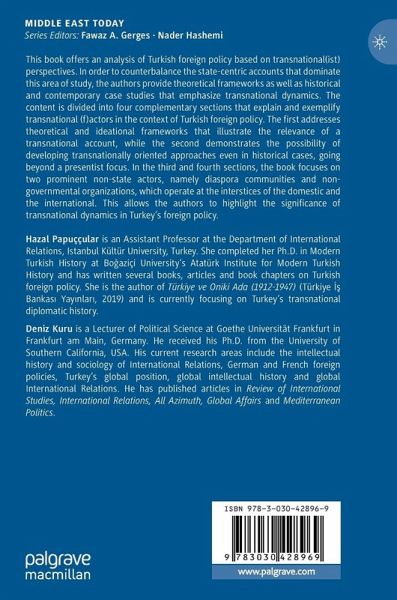 Chapter 1. Introduction: Transcending the State: A Transnational Account of Turkish Foreign Policy.- Part I. Ideas on Turkish Transnationalism: Theory, Practice, and Intellectual Currents.- Chapter 2. Transnationalized Accounts of Turkish Foreign Policy.- Chapter 3. Transnationality, Foreign Policy Research and the Cosmopolitan Alternative: On the practice of Domestic Global Politics.- Chapter 4. Imperial Transnationalism: Turkish Middle East-Oriented Foreign Policy Expert Apparatus (1998-2011).- Part II. Transnationalism in Turkish Diplomacy: A Historical Account.- Chapter 5. Transnational Issues, Non-Governmental Organizations and the Genesis of Modern Turkish Diplomacy.- Chapter 6. The Sanjak of Alexandretta (Hatay) in Turkish Foreign Policy: A Case of "Accidental Diaspora" and Kin-State Politics.- Part III. Asset or Liability? Diasporas and Transnational Communities in Turkish Foreign Policy.- Chapter 7. Turkey and Syrian Turkmens in the "New Middle East Cold War": A CriticalView from the Kin-State.- Chapter 8. Constructing Liberal Subjects? Turkey's New Diaspora Strategy.- Chapter 9. Jews from Turkey in Israel and Cultural Diplomacy (1996-2006).- Part IV. NGOs as Transnational Actors in the Formation and Implementation of Turkish Foreign Policy.- Chapter 10. "Humanitarianism" Transformed? Analyzing the Role of Transnational Humanitarian NGOs in Turkish Foreign Policy towards the Middle East in the 2000s.- Chapter 11. Business Actors as Holders of Transnational Relations: What role for them in Turkish Foreign Policy?.- Chapter 12. Conclusion.