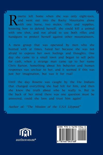 Rosette left home when she was only eight-teen, and went out into the Rocky Mountains alone with one horse, two mules, rifles and supplies. knowing how to defend herself, she could kill a animal with one shot, and not afraid to use both rifles and handguns to protect herself against other mountaineers. A mess group that was operated by men who she hunted with at times, hated her because she was not afraid to express her own feelings and thoughts. One day she came to a small town and began to sell pelts for cash, when a strange man came up to her name Chris Barton. Something about his behavior and human responses was unclear to her, and it seemed if this was just her imagination, but was it for real? Until the day Rosette was caught by the Ute Indians that changed everything she had felt for him, and then she knew the truth about who he really is. But in the back of her mind there was one question must be answered, could she love and trust him again?