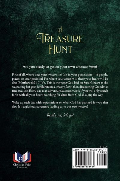 Are you ready to go on your own treasure hunt? First of all, where does your treasure lie? Is it in your possessions--in people, places, or your position? For where your treasure is, there your heart will be also (Matthew 6:21 NJV). This is the verse God laid on Susan's heart as she was taking her grandchildren on a treasure hunt, then discovering Grandma's true treasure! Every day is an adventure, a treasure hunt if you will only search for it with all your heart, watching for clues from God all along the way. Wake up each day with expectations on what God has planned for you that day. It is a glorious adventure leading us to our true treasure! Ready, set, let's go!