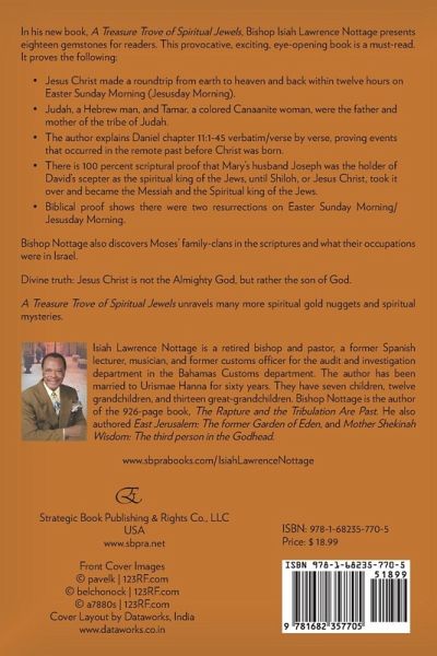 In his new book, A Treasure Trove of Spiritual Jewels, Bishop Isiah Lawrence Nottage presents eighteen gemstones for readers. This provocative, exciting, eye-opening book is a must-read. It proves the following: ¿ Jesus Christ made a roundtrip from earth to heaven and back within twelve hours on Easter Sunday Morning (Jesusday Morning). ¿ Judah, a Hebrew man, and Tamar, a colored Canaanite woman, were the father and mother of the tribe of Judah. ¿ The author explains Daniel chapter 11:1-45 verbatim/verse by verse, proving events that occurred in the remote past before Christ was born. ¿ There is 100 percent scriptural proof that Mary's husband Joseph was the holder of David's scepter as the spiritual king of the Jews, until Shiloh, or Jesus Christ, took it over and became the Messiah and the Spiritual king of the Jews. ¿ Biblical proof shows there were two resurrections on Easter Sunday Morning/Jesusday Morning. Bishop Nottage also discovers Moses' family-clans in the scriptures and what their occupations were in Israel. Divine truth: Jesus Christ is not the Almighty God, but rather the son of God. A Treasure Trove of Spiritual Jewels unravels many more spiritual gold nuggets and spiritual mysteries.