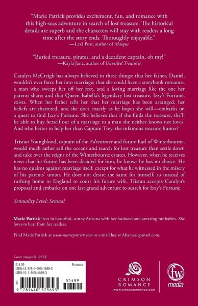 Caralyn McCreigh has always believed in three things: that her father, Daniel, would never force her into marriage; that she could have a storybook romance with a man who sweeps her off her feet and a loving marriage like the one her parents share; and that the Queen Isabella's legendary lost treasure, Izzy's Fortune, exists. When her father tells her that her marriage has been arranged, all her beliefs are shattered, and she does exactly as he hopes she will-embarks on a quest to find Izzy's Fortune. She believes that if she finds the treasure, she'll be able to buy herself out of a marriage to a man she doesn't know or love. And who better to help her than Captain Trey, the infamous treasure hunter? Tristan Youngblood, captain of the Adventurer and future Earl of Winterbourne, would much rather sail the oceans and search for lost treasure than settle down and take over the reigns of the Winterbourne estates. However, when he receives news that his future has been decided for him, he knows he has no choice. He has no qualms against marriage itself, except for what he witnessed in the misery of his parent's union. He does not desire the same for himself, so instead of rushing home to England to court his expected wife, Tristan accepts Caralyn's proposal and embarks on one last grand adventure to search for Izzy's Fortune. Sensuality Level: Sensual