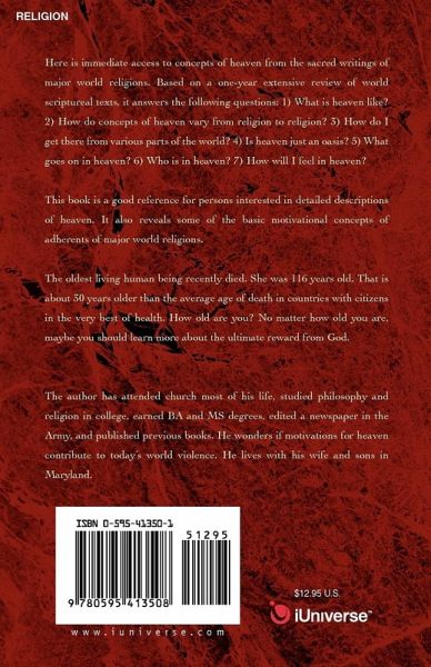 Here is immediate access to concepts of heaven from the sacred writings of major world religions. Based on a one-year extensive review of world scriptureal texts, it answers the following questions: 1) What is heaven like? 2) How do concepts of heaven vary from religion to religion? 3) How do I get there from various parts of the world? 4) Is heaven just an oasis? 5) What goes on in heaven? 6) Who is in heaven? 7) How will I feel in heaven? This book is a good reference for persons interested in detailed descriptions of heaven. It also reveals some of the basic motivational concepts of adherents of major world religions. The oldest living human being recently died. She was 116 years old. That is about 30 years older than the average age of death in countries with citizens in the very best of health. How old are you? No matter how old you are, maybe you should learn more about the ultimate reward from God?