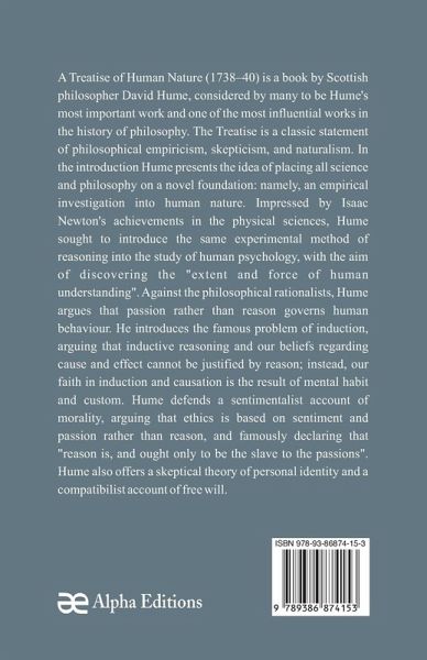 A Treatise of Human Nature (1738–40) is a book by Scottish philosopher David Hume, considered by many to be Hume's most important work and one of the most influential works in the history of philosophy. The Treatise is a classic statement of philosophical empiricism, skepticism, and naturalism. In the introduction Hume presents the idea of placing all science and philosophy on a novel foundation: namely, an empirical investigation into human nature. Impressed by Isaac Newton's achievements in the physical sciences, Hume sought to introduce the same experimental method of reasoning into the…mehr