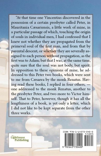 "At that time one Vincentius discovered in the possession of a certain presbyter called Peter, in Mauritania Cæsariensis, a little work of mine, in a particular passage of which, touching the origin of souls in individual men, I had confessed that I knew not whether they are propagated from the primeval soul of the first man, and from that by parental descent, or whether they are severally assigned to each person without propagation, as the first was to Adam; but that I was, at the same time, quite sure that the soul was not body, but spirit. In opposition to these opinions of mine, he addressed to this Peter two books, which were sent to me from Cæsarea by the monk Renatus. Having read these books, I replied in four others, -one addressed to the monk Renatus, another to the presbyter Peter, and two more to Victor himself. That to Peter, however, though it has all the lengthiness of a book, is yet only a letter, which I did not like to be kept separate from the other three works. In all of them, while discussing many points which were unavoidable, I defended my hesitancy on the point of the origin of the souls which are given to individual men; and I pointed out this man's many errors and presumptuous pravity. At the same time, I treated the young man as gently as I could, -not as one who ought to be denounced all out of hand, but as one who ought to be still instructed; and I accepted the account of his conduct which he wrote back to me. In this work of mine, the book addressed to Renatus begins with these words: "Your sincerity towards us;" while that which was written to Peter begins thus: "To his Lordship, my dearly beloved brother and co-presbyter Peter." Of the last two books, which are addressed to Vincentius Victor, the former one thus opens: "As to that which I have thought it my duty to write to you."