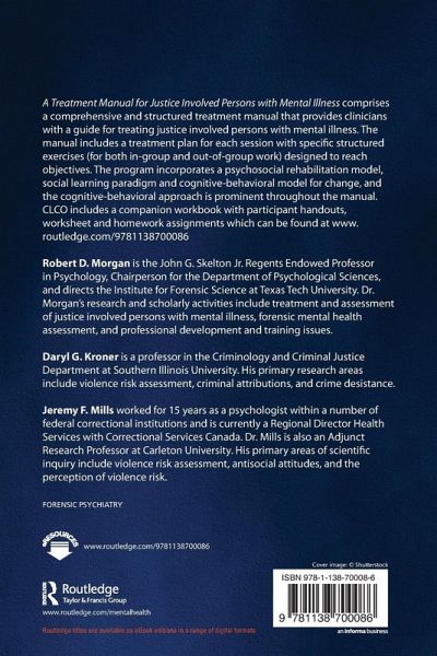 A Treatment Manual for Justice Involved Persons with Mental Illness comprises a comprehensive and structured treatment manual that provides clinicians a guide for treating justice involved persons with mental illness. The manual includes a treatment plan for each session with specific structured exercises (for both in-group and out of group work) designed to teach objectives each session. The program incorporates a psychosocial rehabilitation model, social learning paradigm and cognitive-behavioral model for change, although cognitive behavioral theory is more prevalent and apparent throughout the manual.