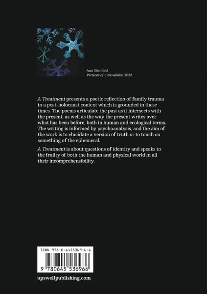 A collection of new work by award-winning poet Ann Shenfield. Delving into family trauma in a post-Holocaust context and informed by psychoanalysis, these poems explore identity and the frailty of the human and physical world. A Treatment presents a poetic reflection of family trauma in a post-holocaust context, which is grounded in these times. The poems articulate the past as it intersects with the present, as well as the way the present writes over what has been before, both in human and ecological terms. The writing is informed by psychoanalysis, and the aim of the work is to elucidate a version of truth or to touch on something of the ephemeral. A Treatment is about questions of identity and speaks to the frailty of both the human and physical world in all their incomprehensibility.