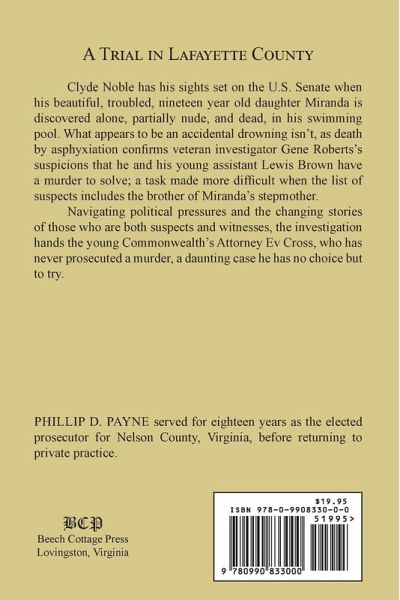 Clyde Noble has his sights set on the U.S. Senate when his beautiful, troubled, nineteen year old daughter Miranda is discovered alone, partially nude, and dead, in his swimming pool. What appears to be an accidental drowning isn't, as death by asphyxiation confirms veteran investigator Gene Roberts's suspicions that he and his young assistant Lewis Brown have a murder to solve; a task made more difficult when the list of suspects includes the brother of Miranda's stepmother. Navigating political pressures and the changing stories of those who are both suspects and witnesses, the investigation hands the young Commonwealth's Attorney Ev Cross, who has never prosecuted a murder, a daunting case he has no choice but to try.