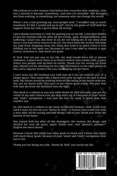 This tribute is to the 'woman' that before her, I was less than 'nothing', with her, I started to become 'something', and now I'm invicible'. She brought me from nothing, to something, too someone who can change the world. When I was a boy growing up, most people said, "I wouldn't live to reach manhood, if I did, I would end up in jail", but by the grace of 'God' and the support from my wife, I prove them all wrong. I give thanks everyday to 'God' for putting you in my life. I also give thanks to you for staying with me after all the wrong, pain, disappointment, and suffering I cause you. But most of all, for not killing me in my sleep (God know's you had every reason to do so). You have been the anchor that kept my ship from dripping away, the thing that held it in place when it was driffing out to the open sea. Because of you I was able to charter a new course, maintain it, and reach our goals. If 'God' had not put you in my life, my ship would have sail to places unknown. A place were there is no future (where time stands still), a place where lost people end up (hell on earth). Thank you for saving me from that, (thank you for showing me the right directions), to the right places in life, and a (special thank's) too you, for helping me get there. I can't even see life (without you with me) all I can see without you 'is' a empty space. That seems like a black hole with no light at the end (a dead end). My future would be nothing without you being in the future with me. You are my better half. That part of me where good exists. The part that will take me from the darkness into the light. This book is a tribute to you (my wife) Rutha M. Hall because, you are the 'wind' in my sail's where ever my ship end's up, it's because of your 'wind' and 'God's' navigation. I was just the tool he used. A blind man that couldn't see. So, this book is a tribute to the most wonderful woman, 'God' could ever send a man, he sent me you "Rutha M. Hall". A woman that could stay with a man after all the wrong and bad things I did to you 'thank you' from the bottom of my heart. You stayed with me after all the disrespect, the women, the drugs, and alcohol for over 30 years, again 'thank you', and "please!!, please!!!" forgive me (once more). Because I know this (ship) has other goals to reach and I know this (ship) will reach those 'goals' because of your 'wind' and 'God's' navigation, how can it not. Thank you for being my wife, "Rutha M. Hall" you saved my life.