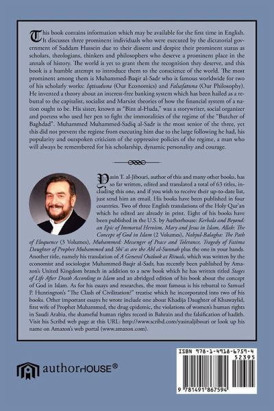 This book contains information which may be available for the first time in English. It discusses three prominent individuals who were executed by the dictatorial government of Saddam Hussein due to their dissent and despite their prominent status as scholars, theologians, thinkers and philosophers who deserve a prominent place in the annals of history. The world is yet to grant them the recognition they deserve, and this book is a humble attempt to introduce them to the conscience of the world. The most prominent among them is Muhammed-Baqir al-Sadr who is famous worldwide for two of his scholarly works: Iqtisaduna (Our Economics) and Falsafatuna (Our Philosophy). He invented a theory about an interest-free banking system which has been hailed as a rebuttal to the capitalist, socialist and Marxist theories of how the financial system of a nation ought to be. His sister, known as "Bint al-Huda," was a storywriter, social organizer and poetess who used her pen to fight the immoralities of the regime of the "Butcher of Baghdad". Muhammed Muhammed-Sadiq al-Sadr is the most senior of the three, yet this did not prevent the regime from executing him due to the large following he had, his popularity and outspoken criticism of the oppressive policies of the regime, a man who will always be remembered for his scholarship, dynamic personality and courage.