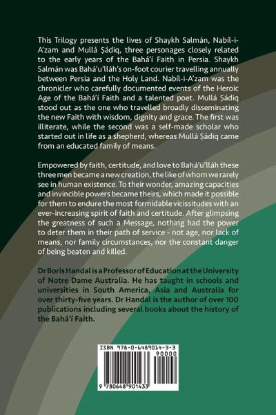 This Trilogy presents the lives of Shaykh Salmán, Nabíl-i-A'zam and Mullá ¿ádiq, three personages closely related to the early years of the Bahá'í Faith in Persia. Shaykh Salmán was Bahá'u'lláh's on-foot courier travelling annually between Persia and the Holy Land. Nabíl-i-A'zam was the chronicler who carefully documented events of the Heroic Age of the Bahá'í Faith and a talented poet. Mullá ¿ádiq stood out as the one who travelled broadly disseminating the new Faith with wisdom, dignity and grace. The first was illiterate, while the second was a self-made scholar who started out in life as a shepherd, whereas Mullá ¿ádiq came from an educated family of means. Empowered by faith, certitude, and love to Bahá'u'lláh these three men became a new creation, the like of whom we rarely see in human existence. To their wonder, amazing capacities and invincible powers became theirs, which made it possible for them to endure the most formidable vicissitudes with an ever-increasing spirit of faith and certitude. After glimpsing the greatness of such a Message, nothing had the power to deter them in their path of service - not age, nor lack of means, nor family circumstances, nor the constant danger of being beaten and killed.
