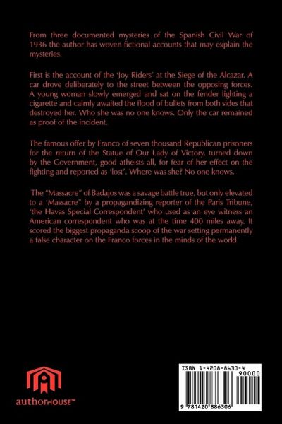 From three documented mysteries of the Spanish Civil War of 1936 the author has woven fictional accounts that may explain the mysteries. First is the account of the 'Joy Riders' at the Siege of the Alcazar. A car drove deliberately to the street between the opposing forces. A young woman slowly emerged and sat on the fender lighting a cigarette and calmly awaited the flood of bullets from both sides that destroyed her. Who she was no one knows. Only the car remained as proof of the incident. The famous offer by Franco of seven thousand Republican prisoners for the return of the Statue of Our Lady of Victory, turned down by the Government, good atheists all, for fear of her effect on the fighting and reported as 'lost'. Where was she? No one knows. The "Massacre" of Badajos was a savage battle true, but only elevated to a 'Massacre" by a propagandizing reporter of the Paris Tribune, 'the Havas Special Correspondent' who used as an eye witness an American correspondent who was at the time 400 miles away. It scored the biggest propaganda scoop of the war setting permanently a false character on the Franco forces in the minds of the world.