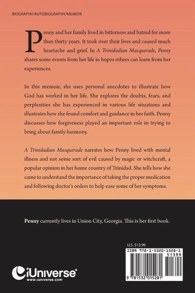 Penny and her family lived in bitterness and hatred for more than thirty years. It took over their lives and caused much heartache and grief. In A Trinidadian Masquerade, Penny shares some events from her life in hopes others can learn from her experiences. In this memoir, she uses personal anecdotes to illustrate how God has worked in her life. She explores the doubts, fears, and perplexities she has experienced in various life situations and illustrates how she found comfort and guidance in her faith. Penny discusses how forgiveness played an important role in trying to bring about family harmony. A Trinidadian Masquerade narrates how Penny lived with mental illness and not some sort of evil caused by magic or witchcraft, a popular opinion in her home country of Trinidad. She tells how she came to understand the importance of taking the proper medication and following doctor’s orders to help ease some of her symptoms.