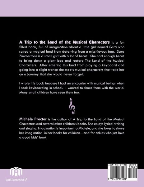 A Trip to the Land of the Musical Characters is a fun filled book; full of imagination about a little girl named Sara who saved a magical land from deterring from a mischievous bee. Sara Zimmerman is a small girl with a lot of heart. She had enough heart to bring down a giant bee and restore The Land of the Musical Characters. After entering this land from playing a keyboard and going into a slight trance she meets musical characters that take her on a journey that she would never forget. I wrote this book because I had an encounter with musical beings when I took keyboarding in school. I wanted to share them with the world. Many small children have seen them too.