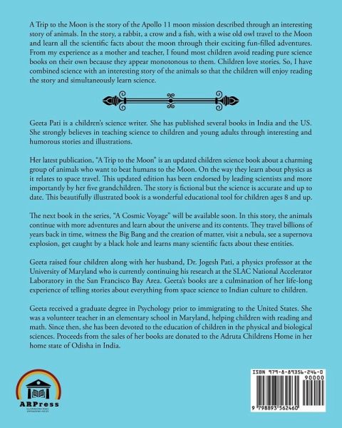 A Trip to the Moon is the story of the Apollo 11 moon mission described through an interesting story of animals. In the story, a rabbit, a crow and a fish, with a wise old owl travel to the Moon and learn all the scientific facts about the moon through their exciting fun-filled adventures. From my experience as a mother and teacher, I found most children avoid reading pure science books on their own because they appear monotonous to them. Children love stories. So, I have combined science with an interesting story of the animals so that the children will enjoy reading the story and simultaneously learn science.…mehr
