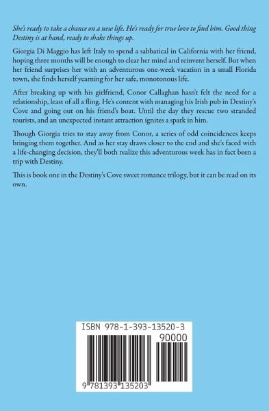 She's ready to take a chance on a new life. He's ready for true love to find him. Good thing Destiny is at hand, ready to shake things up. Giorgia Di Maggio has left Italy to spend a sabbatical in California with her friend, hoping three months will be enough to clear her mind and reinvent herself. But when her friend surprises her with an adventurous one-week vacation in a small Florida town, she finds herself yearning for her safe, monotonous life. After breaking up with his girlfriend, Conor Callaghan hasn't felt the need for a relationship, least of all a fling. He's content with managing his Irish pub in Destiny's Cove and going out on his friend's boat. Until the day they rescue two stranded tourists, and an unexpected instant attraction ignites a spark in him. Though Giorgia tries to stay away from Conor, a series of odd coincidences keeps bringing them together. And as her stay draws closer to the end and she's faced with a life-changing decision, they'll both realize this adventurous week has in fact been a trip with Destiny. This is book one in the Destiny's Cove sweet romance trilogy, but it can be read on its own.