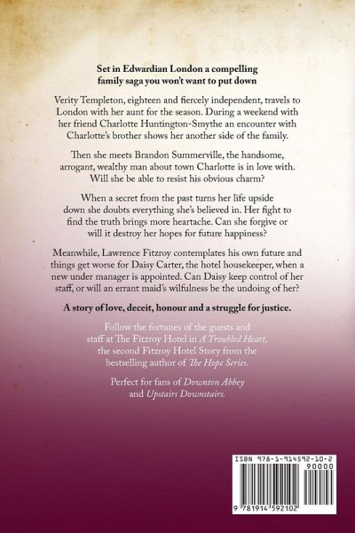 Verity Templeton, eighteen and fiercely independent, travels to London with her aunt for the season. During a weekend with her friend Charlotte Huntington-Smythe an encounter with Charlotte's brother shows her another side of the family. Then she meets Brandon Summerville, the handsome, arrogant, wealthy man about town Charlotte is in love with. Will she be able to resist his obvious charm? When a secret from the past turns her life upside down she doubts everything she's believed in. Her fight to find the truth brings more heartache. Can she forgive or will it destroy her hopes for future happiness? Meanwhile, Lawrence Fitzroy contemplates his own future and things get worse for Daisy Carter, the hotel housekeeper, when a new Under Manager is appointed. Can Daisy keep control of her staff, or will an errant maid's wilfulness be the undoing of her? A story of love, deceit, honour and a struggle for justice. Follow the fortunes of the guests and staff at The Fitzroy Hotel in A Troubled Heart, the second Fitzroy Hotel Story. Perfect for fans of Downton Abbey and Upstairs Downstairs. .