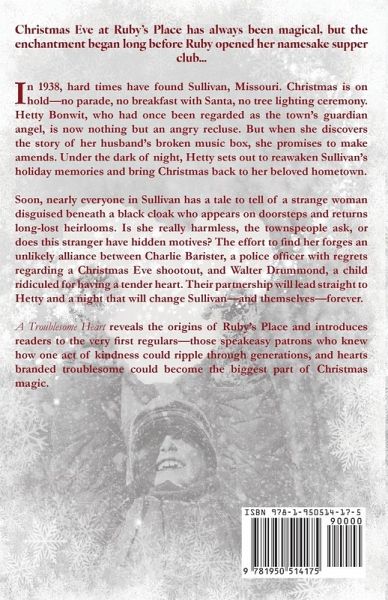 Christmas Eve at Ruby's Place has always been magical, but the enchantment began long before Ruby opened her namesake supper club... In 1938, hard times have found Sullivan, Missouri. Christmas is on hold-no parade, no breakfast with Santa, no tree lighting ceremony. Hetty Bonwit, who had once been regarded as the town's guardian angel, is now nothing but an angry recluse. But when she discovers the story of her husband's broken music box, she promises to make amends. Under the dark of night, Hetty sets out to reawaken Sullivan's holiday memories and bring Christmas back to her beloved hometown. Soon, nearly everyone in Sullivan has a tale to tell of a strange woman disguised beneath a black cloak who appears on doorsteps and returns long-lost heirlooms. Is she really harmless, the townspeople ask, or does this stranger have hidden motives? The effort to find her forges an unlikely alliance between Charlie Barister, a police officer with regrets regarding a Christmas Eve shootout, and Walter Drummond, a child ridiculed for having a tender heart. Their partnership will lead straight to Hetty and a night that will change Sullivan-and themselves-forever. A Troublesome Heart reveals the origins of Ruby's Place and introduces readers to the very first regulars-those speakeasy patrons who knew how one act of kindness could ripple through generations, and hearts branded troublesome could become the biggest part of Christmas magic.