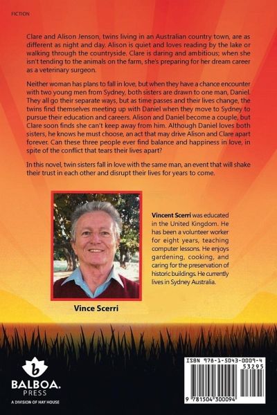 " Clare and Alison Jenson, twins living in an Australian country town, are as different as night and day. Alison is quiet and loves reading by the lake or walking through the countryside. Clare is daring and ambitious; when she isn't tending to the animals on the farm, she's preparing for her dream career as a veterinary surgeon. Neither woman has plans to fall in love, but when they have a chance encounter with two young men from Sydney, both sisters are drawn to one man, Daniel. They all go their separate ways, but as time passes and their lives change, the twins find themselves meeting up with Daniel when they move to Sydney to pursue their education and careers. Alison and Daniel become a couple, but Clare soon finds she can't keep away from him. Although Daniel loves both sisters, he knows he must choose, an act that may drive Alison and Clare apart forever. Can these three people ever find balance and happiness in love, in spite of the conflict that tears their lives apart? In this novel, twin sisters fall in love with the same man, an event that will shake their trust in each other and disrupt their lives for years to come."