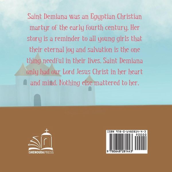 Saint Demiana was an Egyptian Christian martyr of the early fourth century. Her story is a reminder to all young girls that their eternal joy and salvation is the one thing needful in their lives. Saint Demiana only had our Lord Jesus Christ in her heart and mind. Nothing else mattered to her. This book gives parents the opportunity to teach our children how to value and prioritise other things more than Jesus. Saint Demiana, however, is a beautiful example, as she reminds us that we always needs to put Jesus first.