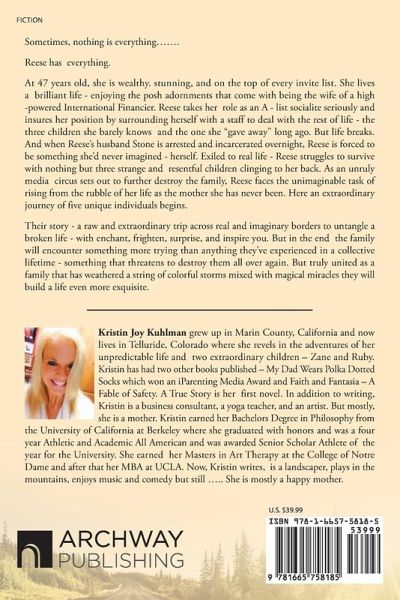 Sometimes, nothing is everything....... Reese has everything. At 47 years old, she is wealthy. stunning, and on the top of every invite list. She lives a brilliant life - enjoying the posh adornments that come with being the wife of a high -powered International Financier. Reese takes her role as an A - list socialite seriously and insures her position by surrounding herself with a staff to deal with the rest of life - the three children she barely knows and the one she "gave away" long ago. But life breaks. And when Reese's husband Stone is arrested and incarcerated overnight, Reese is forced to be something she'd never imagined - herself. Exiled to real life - Reese struggles to survive with nothing but three strange and resentful children clinging to her back. As an unruly media circus sets out to further destroy the family, Reese faces the unimaginable task of rising from the rubble of her life as the mother she has never been. Here an extraordinary journey of five unique individuals begins. Their story - a raw and extraordinary trip across real and imaginary borders to untangle a broken life - with enchant, frighten, surprise, and inspire you. But in the end the family will encounter something more trying than anything they've experienced in a collective lifetime - something that threatens to destroy them all over again. But truly united as a family that has weathered a string of colorful storms mixed with magical miracles they will build a life even more exquisite.