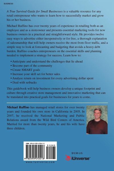 A True Survival Guide for Small Businesses is a valuable resource for any retail entrepreneur who wants to learn how to successfully market and sell his or her business. Michael Ruffino has over twenty years of experience in retailing both as an employee and as a storeowner and presents essential marketing tools for new business owners in a practical and straightforward style. He provides twelve easy ways to advertise either inexpensively or for free, a thorough explanation of salesmanship that will help owners receive the most from floor traffic, and a simple way to look at forecasting and budgeting that avoids a heavy debt burden. Ruffino coaches entrepreneurs on the essential skills and planning needed to implement a strategy for success. Learn how to: Anticipate and understand the challenges that lie ahead Become part of the community Create S.M.A.R.T. goals Increase your skill set for better sales Analyze return on investment for every advertising dollar spent Deal with setbacks This guidebook will help business owners develop a unique footprint and culture through creative store management and innovative marketing that can be translated into practical goals for businesses for years to come.