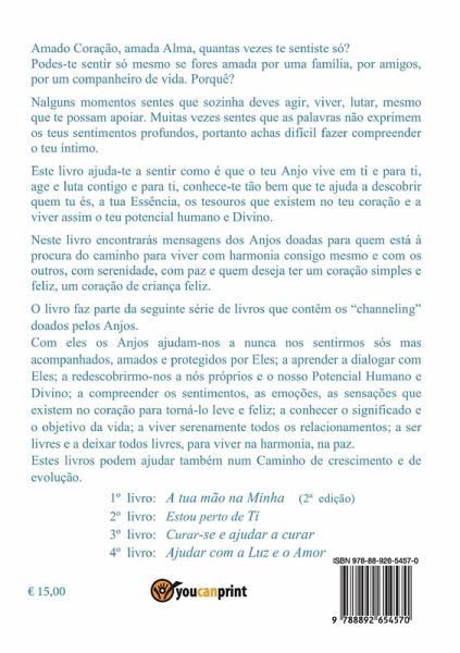 Amato Cuore, amata Anima, quante volte ti sei sentita sola? Ti puoi sentire sola anche se sei amata da una famiglia, da amici, da un compagno di vita. Perché? In alcuni momenti senti che da sola devi agire, vivere, lottare, anche se loro ti possono sostenere. Spesso senti che le parole non esprimono i tuoi sentimenti profondi, quindi ti è difficile far comprendere il tuo intimo. Questo libro ti aiuta a sentire come il tuo Angelo vive in te e per te, agisce e lotta con te e per te, ti conosce così bene che ti aiuta a scoprire chi sei, la tua Essenza, i tesori che vi sono nel tuo cuore e a vivere così il tuo potenziale umano e Divino. Il libro fa parte della seguente serie di libri che contengono i channeling donati dagli Angeli. Con questi messaggi gli Angeli ci aiutano a percorrere la Via per vivere in armonia con se stessi e con gli altri, nella serenità, nella pace, ad avere un cuore semplice e gioioso, un cuore di bimbo felice. Questi libri possono aiutare anche in un Cammino di crescita e di evoluzione. 1º libro: La tua mano nella Mia (2ª edizione) 2º libro: Ti sono accanto 3º libro: Guarirsi e aiutare a guarire 4º libro: Aiutare con la Luce e l'Amore