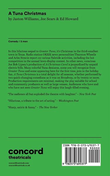 In this hilarious sequel to Greater Tuna, it's Christmas in the third-smallest town in Texas. Radio station OKKK news personalities Thurston Wheelis and Arles Struvie report on various Yuletide activities, including the hot competition in the annual lawn-display contest. In other news, voracious Joe Bob Lipsey's production of A Christmas Carol is jeopardized by unpaid electric bills. Many colorful Tuna denizens, some you will recognize from Greater Tuna and some appearing here for the first time, join in the holiday fun. A Tuna Christmas is a total delight for all seasons, whether performed by two quick-changing comedians as it was on Broadway, or by twenty or more. Production requirements are minimal, making the play suitable for school and community producers as well as large venues. Audiences who have and who have not seen Greater Tuna will enjoy this laugh-filled evening.