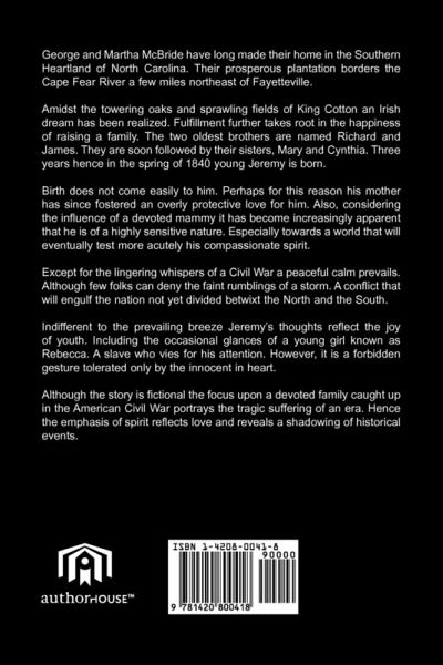 George and Martha McBride have long made their home in the Southern Heartland of North Carolina. Their prosperous plantation borders the Cape Fear River a few miles northeast of Fayetteville. Amidst the towering oaks and sprawling fields of King Cotton an Irish dream has been realized. Fulfillment further takes root in the happiness of raising a family. The two oldest brothers are named Richard and James. They are soon followed by their sisters, Mary and Cynthia. Three years hence in the spring of 1840 young Jeremy is born. Birth does not come easily to him. Perhaps for this reason his mother has since fostered an overly protective love for him. Also, considering the influence of a devoted mammy it has become increasingly apparent that he is of a highly sensitive nature. Especially towards a world that will eventually test more acutely his compassionate spirit. Except for the lingering whispers of a Civil War a peaceful calm prevails. Although few folks can deny the faint rumblings of a storm. A conflict that will engulf the nation not yet divided betwixt the North and the South. Indifferent to the prevailing breeze Jeremy's thoughts reflect the joy of youth. Including the occasional glances of a young girl known as Rebecca. A slave who vies for his attention. However, it is a forbidden gesture tolerated only by the innocent in heart. Although the story is fictional the focus upon a devoted family caught up in the American Civil War portrays the tragic suffering of an era. Hence the emphasis of spirit reflects love and reveals a shadowing of historical events.