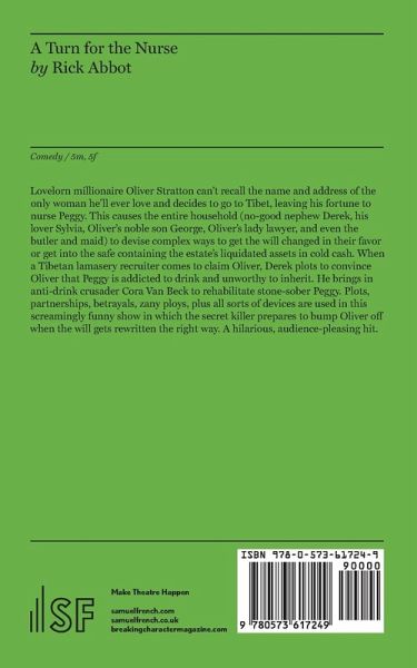 Lovelorn millionaire Oliver Stratton can't recall the name and address of the only woman he'll ever love and decides to go to Tibet, leaving his fortune to nurse Peggy. This causes the entire household (no-good nephew Derek, his lover Sylvia, Oliver's noble son George, Oliver's lady lawyer, and even the butler and maid) to devise complex ways to get the will changed in their favor or get into the safe containing the estate's liquidated assets in cold cash. When a Tibetan lamasery recruiter comes to claim Oliver, Derek plots to convince Oliver that Peggy is addicted to drink and unworthy to inherit. He brings in anti-drink crusader Cora Van Beck to rehabilitate stone-sober Peggy. Plots, partnerships, betrayals, zany ploys, plus all sorts of devices are used in this screamingly funny show in which the secret killer prepares to bump Oliver off when the will gets rewritten the right way. A hilarious, audience-pleasing hit.