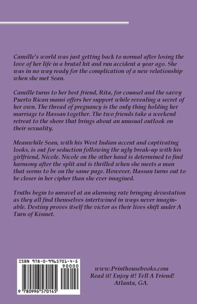 Camille's world was just getting back to normal after losing the love of her life in a brutal hit and run accident a year ago. She was in no way ready for the complication of a new relationship when she met Sean. Camille turns to her best friend, Rita, for counsel and the savvy Puerto Rican mami offers her support while revealing a secret of her own. The thread of pregnancy is the only thing holding her marriage to Hassan together. The two friends take a weekend retreat to the shore that brings about an unusual outlook on their sexuality. Meanwhile Sean, with his West Indian accent and captivating looks, is out for seduction following the ugly break-up with his girlfriend, Nicole. Nicole on the other hand is determined to find harmony after the split and is thrilled when she meets a man that seems to be on the same page. However, Hassan turns out to be closer in her cipher than she ever imagined. Truths begin to unravel at an alarming rate bringing devastation as they all find themselves intertwined in ways never imaginable. Destiny proves itself the victor as their lives shift under A Turn of Kismet.