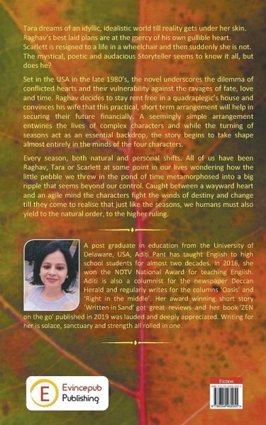 Tara dreams of an idyllic, idealistic world till reality gets under her skin. Raghav's best laid plans are at the mercy of his own gullible heart. Scarlett is resigned to a life in a wheelchair and then suddenly she is not. The mystical, poetic and audacious Storyteller seems to know it all, but does he? Set in the USA in the late 1980's, the novel underscores the dilemma of conflicted hearts and their vulnerability against the ravages of fate, love and time. Raghav decides to stay rent free in a quadraplegic's house and convinces his wife that this practical, short term arrangement will help in securing their future financially. A seemingly simple arrangement entwines the lives of complex characters and while the turning of seasons act as an essential backdrop, the story begins to take shape almost entirely in the minds of the four characters. Every season, both natural and personal shifts. All of us have been Raghav, Tara or Scarlett at some point in our lives wondering how the little pebble we threw in the pond of time metamorphosed into a big ripple that seems beyond our control. Caught between a wayward heart and an agile mind the characters fight the winds of destiny and change till they come to realise that just like the seasons, we humans must also yield to the natural order, to the higher ruling.