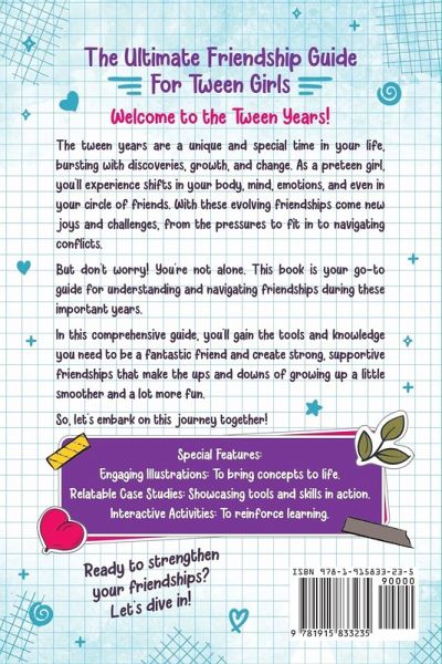 Navigating friendships during the tween years can be challenging. Coping with the ups and downs, fitting in, and identifying genuine friends can be tough. This book is your tween's companion for understanding and enjoying friendships during the tween years and beyond. Within these pages, your tween will discover:What real friendship looks like The different kinds of friends How to make new friends and build relationships How to spot the difference between healthy and unhealthy friendships Tips for managing conflicts and jealousy Strategies for dealing with friends growing apart, bullying, and peer pressure How to manage digital interactions with friends Understanding how puberty can impact friendships. Each chapter includes case studies and engaging activities designed to reinforce their knowledge. By the end of this book, your tween will possess the tools and insights required to be a great friend and build strong, supportive friendships.