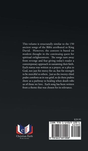 This volume is structurally similar to the 150 ancient songs of the Bible attributed to King David. However, the content is based on modern thought in the continuing quest for spiritual enlightenment. The songs turn away from revenge and fear giving today's reader a contemporary approach to sustaining their faith. Each stanza was written as a prayer, or a plea to God, not just for mercy for us, but for strength to be merciful to others. Just as the twenty-third psalm comforts us in our grief, so do these psalms show us a pathway to healing when death robs us of those we love. Each song has been written from a theme that was chosen for its relevance.
